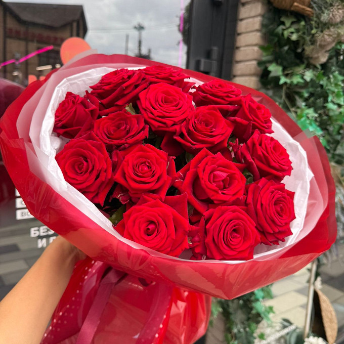 15 красных роз Кения, 50 см в белой матовой плёнке