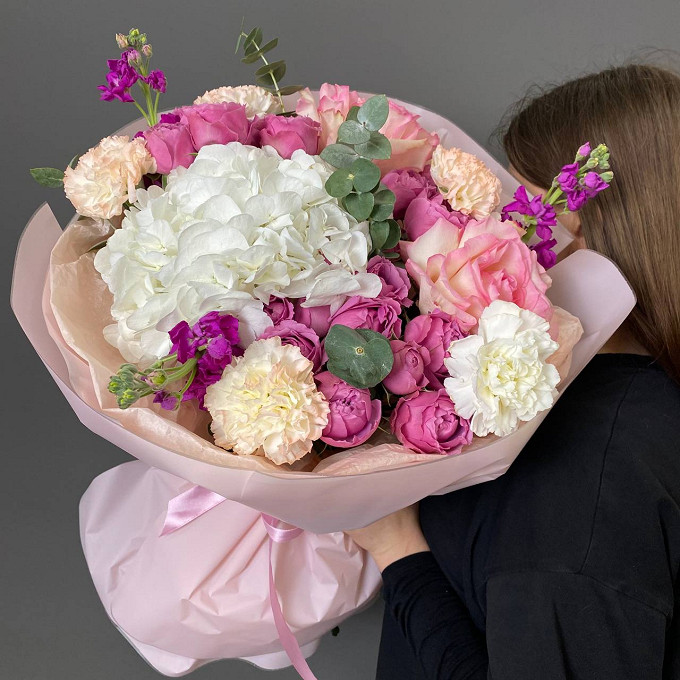 гортензия 1 шт, гвоздика 5 шт, маттиола 3 шт, эвкалипт 1 шт, роза одноголовая 2 шт, кустовая пионовидная 4 шт, тишью 2 шт, пленка 2 шт, лента